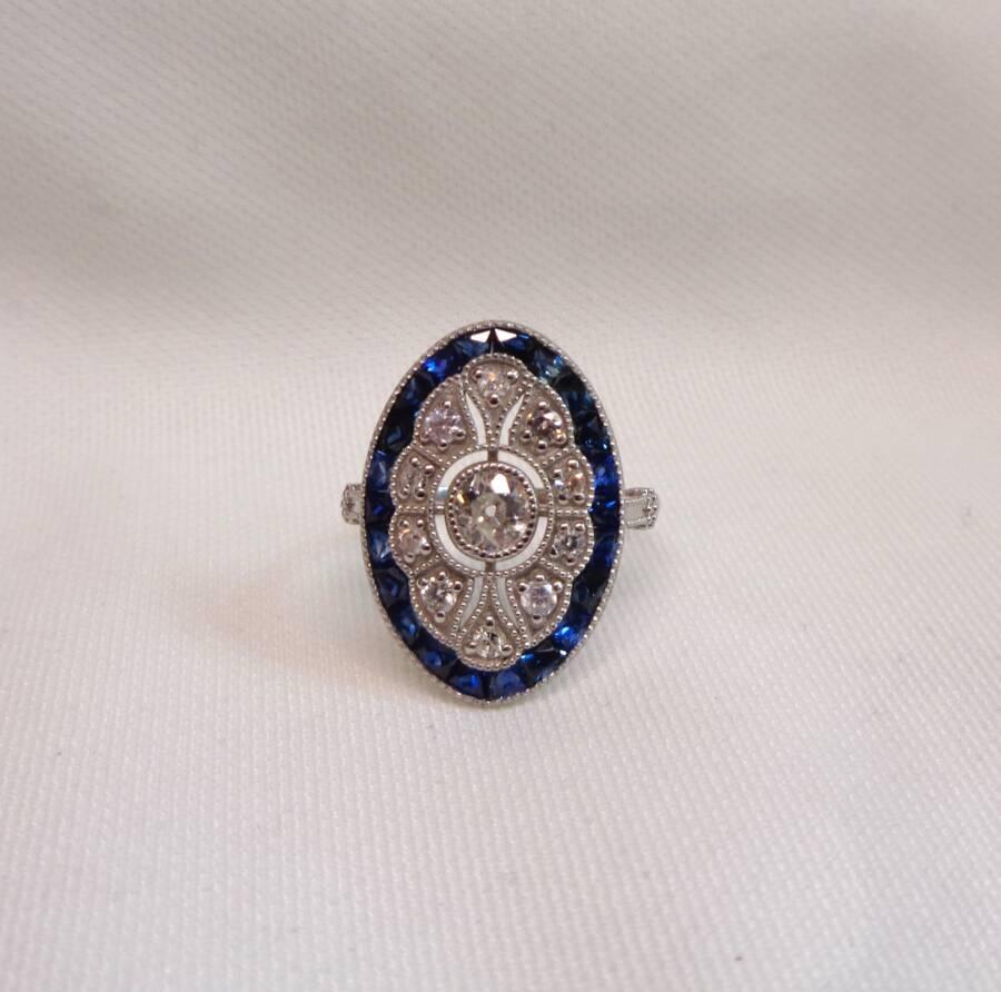 A stunning Sapphire and Diamond ring set in platinum in the ever-popular Art Deco style.