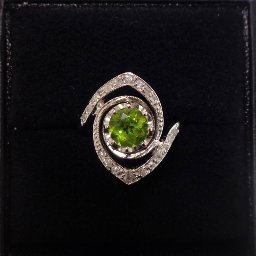 This Platinum ring featured a central show stopping peridot that is at the heart of a hypnotic swirl of diamonds.