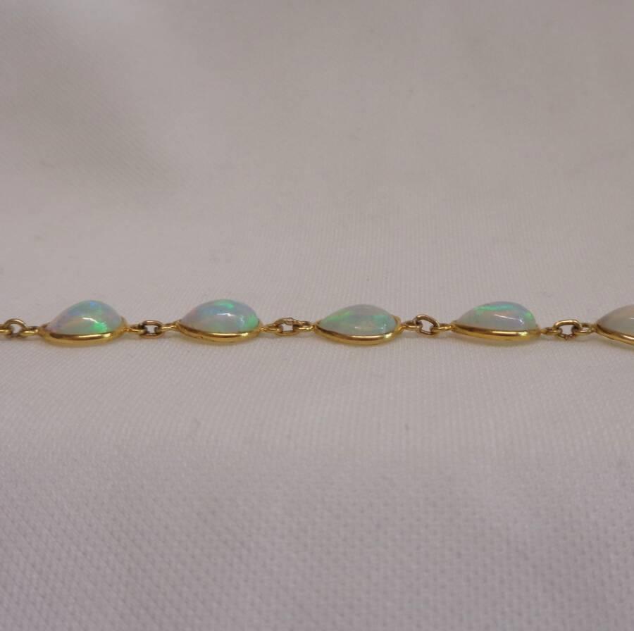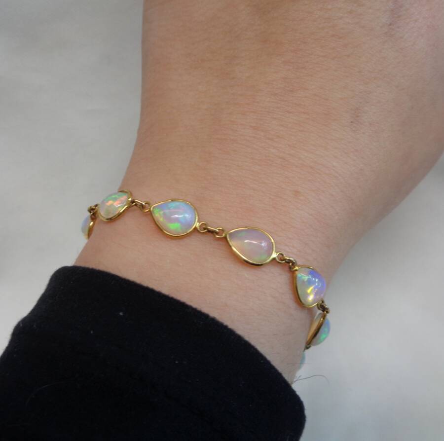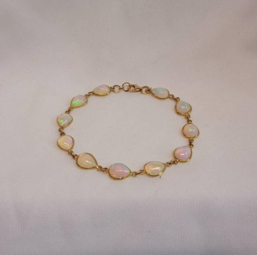 A Stunning 14ct Yellow Gold Opal Bracelet set with eleven pear shaped Natural Opal gemstones.