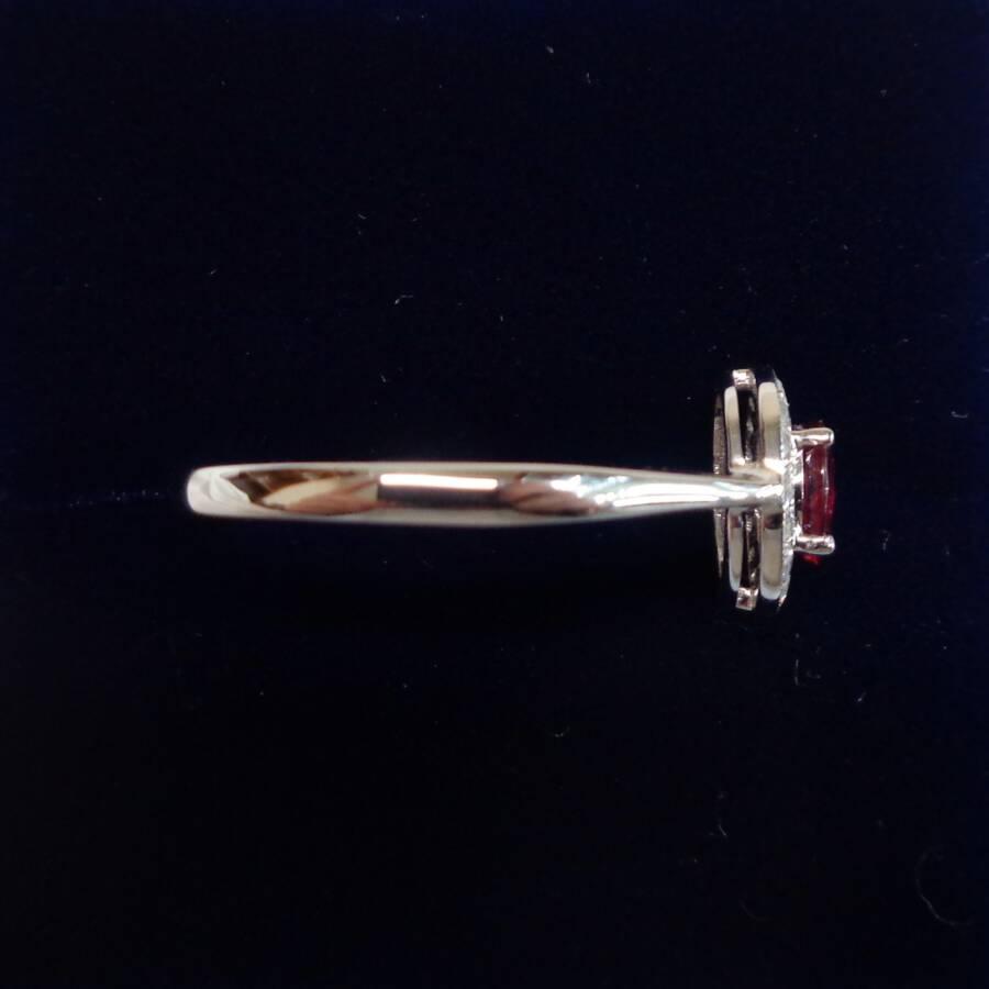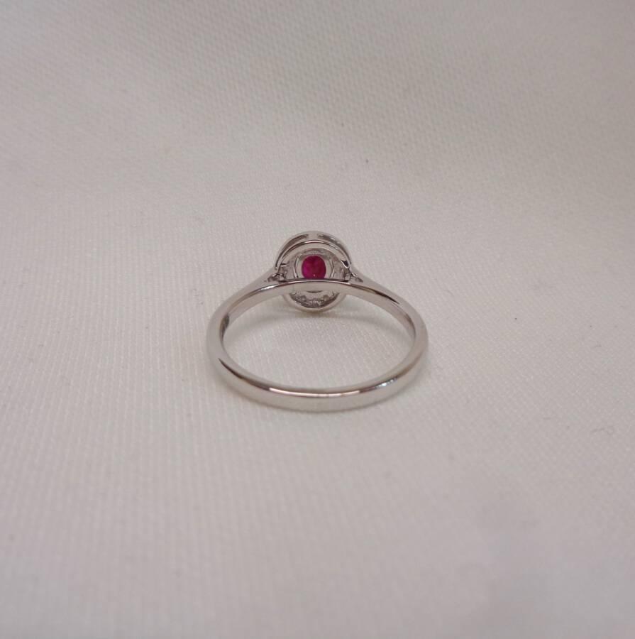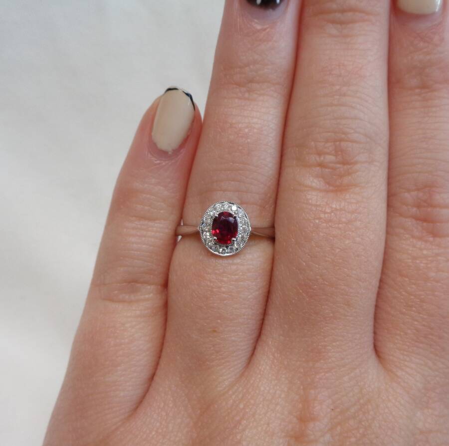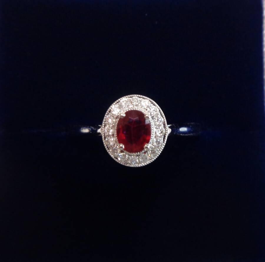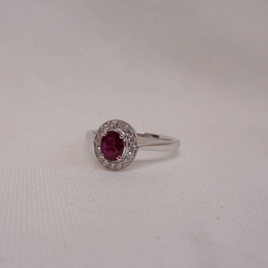 The central oval Ruby is a rich, deep red set with four claws. Framing the ruby is a halo of Diamonds that compliment the stunning Ruby to the centre.