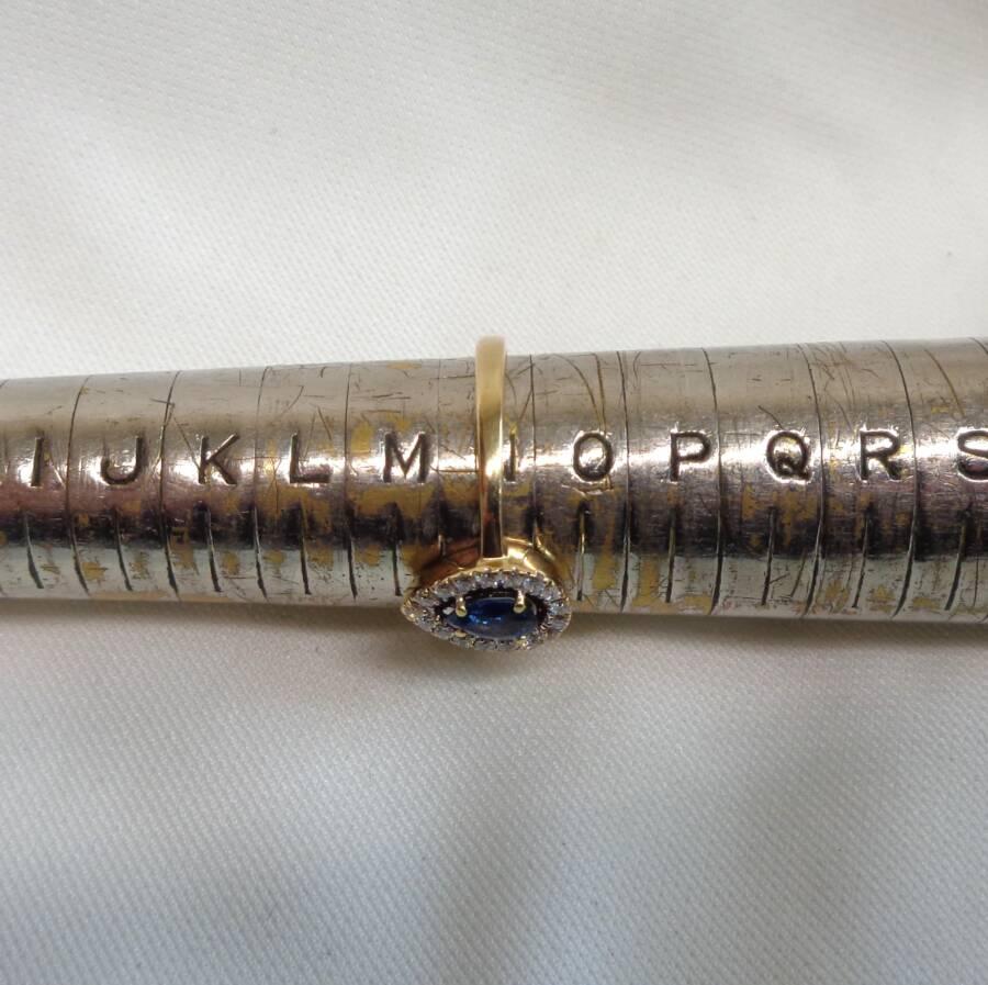 At the centre of this ring is a pear shaped sapphire which is a beautiful mid blue in colour and secured in a four claw setting