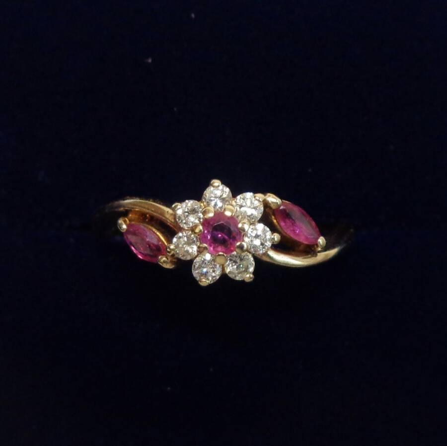 A beautiful Diamond and Ruby flower cluster ring set in 9ct quality yellow Gold.