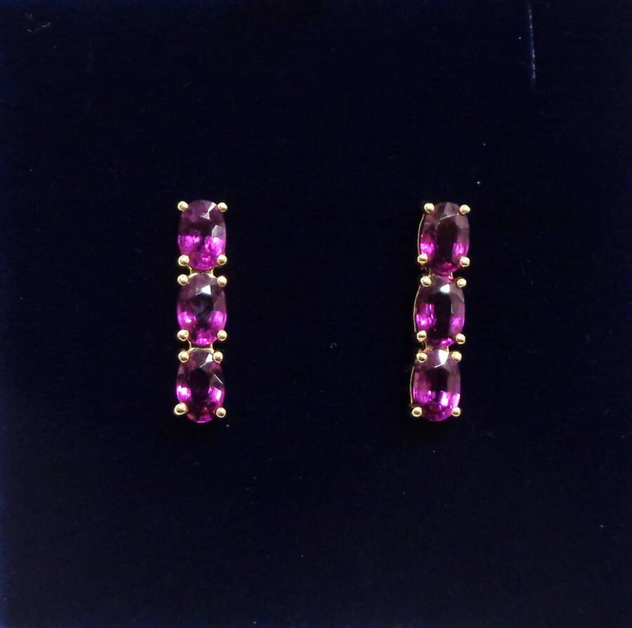 This pair of earrings feature three oval-cut tourmalines in each earring, set in a vertical line secured in a four claw setting.