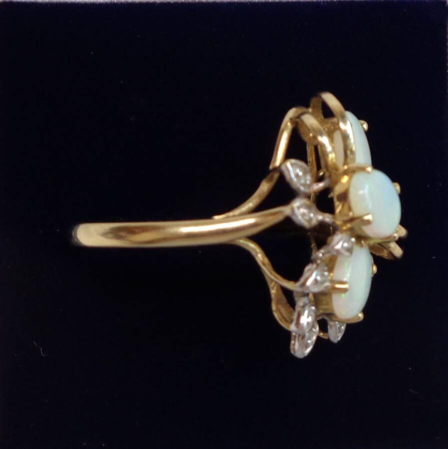 This ring features three oval cut opals, framed by eleven round brilliant Diamonds set in the leaves spread across the top of the ring.