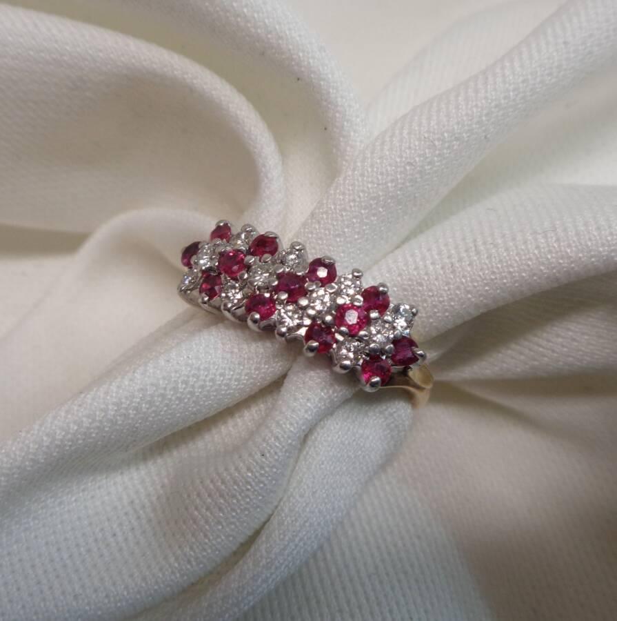 This Ring is made up of three rows of alternating Diamonds and Rubies to form this diagonal pattern