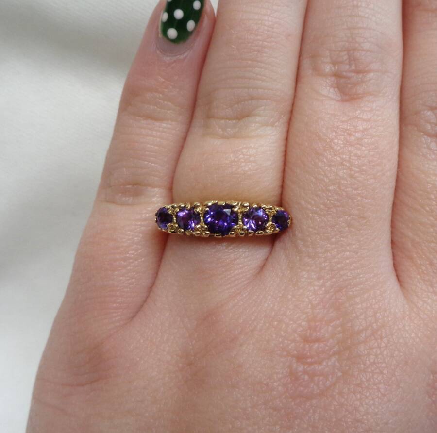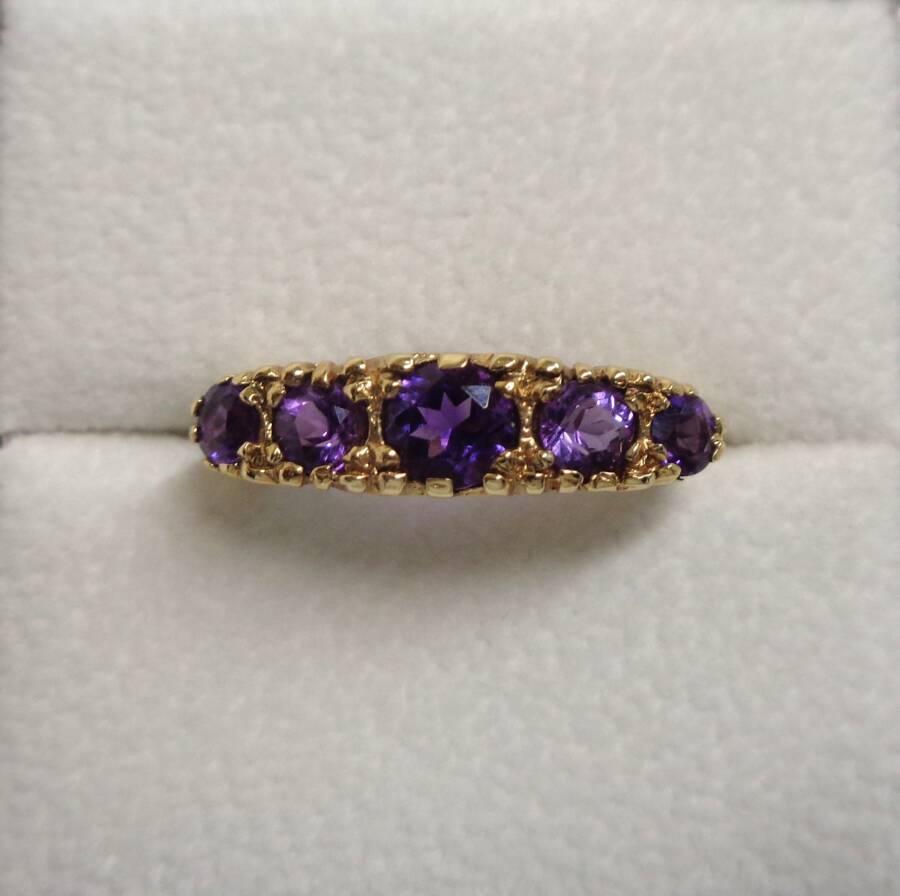 Quality five stone claw set Amethyst in 9ct yellow Gold